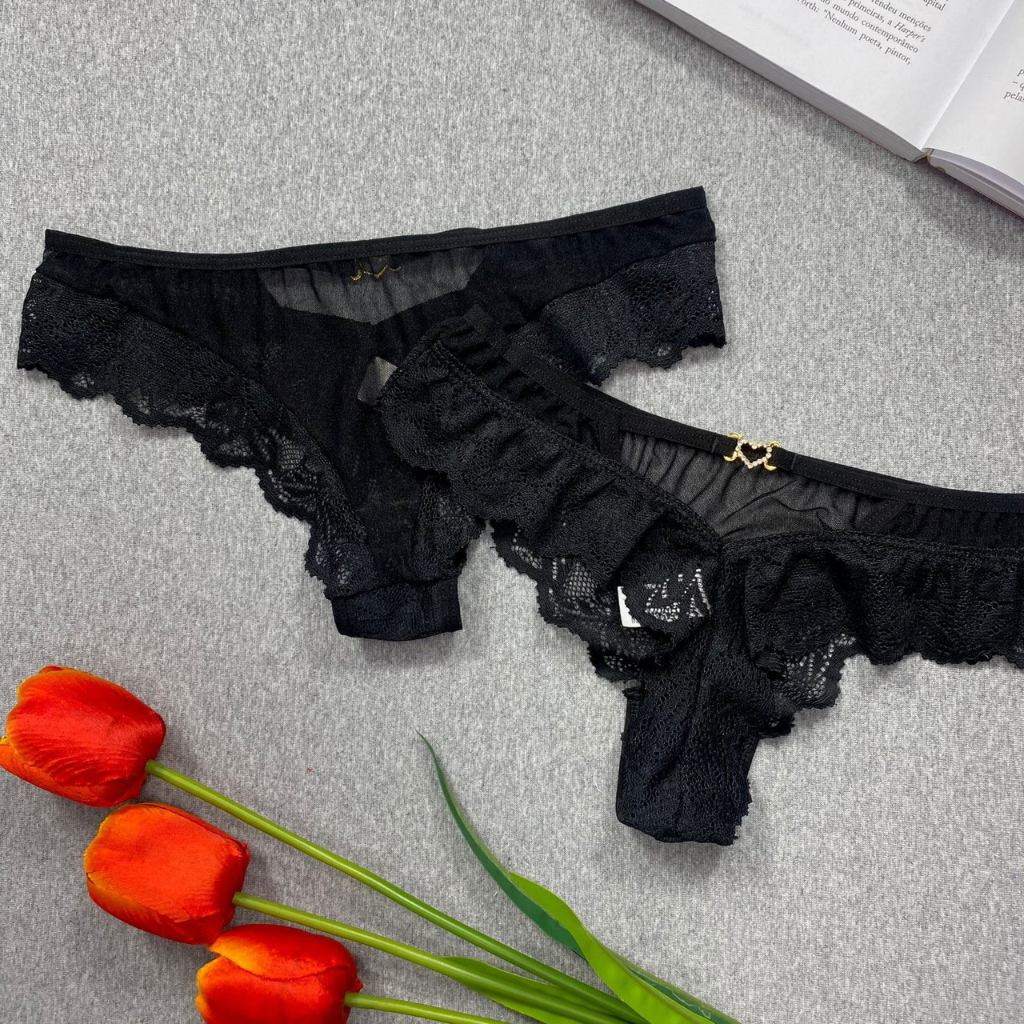 O design dessa calcinha mistura o tecido principal que é um tule leve, quase transparente, que dá um ar etéreo, enquanto a renda que contorna toda a calcinha traz um desenho delicado, cheio de pequenos detalhes, com um pequeno adorno dourado com strass ao centro que adiciona um toque de sofisticação, quase como um acessório embutido na peça.